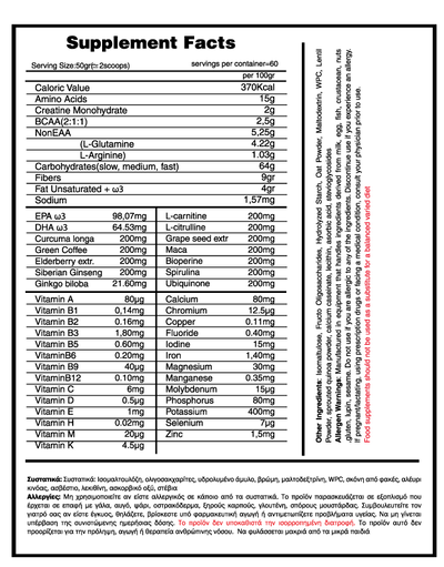 Πιο συγκεκριμένα παρέχει στο σώμα σας έναν μοναδικό συνδυασμό κρεατίνης, αμινοξέων BCAA, γλουταμίνης, υδατανθράκων, ωμέγα 3 λιπαρών οξέων, βιταμινών, μετάλλων και άλλων παραγόντων που απαιτούνται για μυϊκή ανάπτυξη, δύναμη και ανάρρωση σε περιόδους σκληρής προπόνησης.