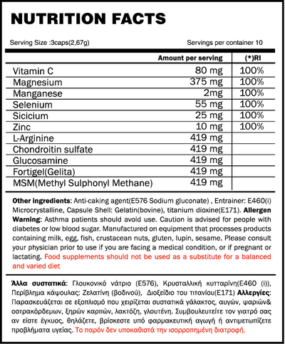 Περιέχει όλους τους γνωστούς συμμάχους των που βελτιώνουν την υγεία των αρθρώσεων MSM, glucosamine, chondroitin καθώς και FORTIGEL®. Είναι ιδανικό για τις αρθρώσεις των αθλητών που επιβαρύνονται καθημερινά από την προπόνηση, τις χρόνιες φλεγμονώδεις καταστάσεις ή ακόμα και από την λανθασμένη στάση σώματος στη δουλειά ή τον ύπνο. Επίσης, είναι ιδανικό για τις μεγαλύτερες ηλικίες που αντιμετωπίζουν προβλήματα φθοράς και αλλοίωσης των αρθρώσεων και των χόνδρων.