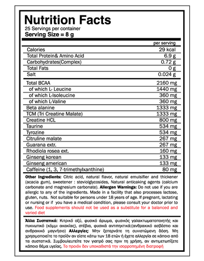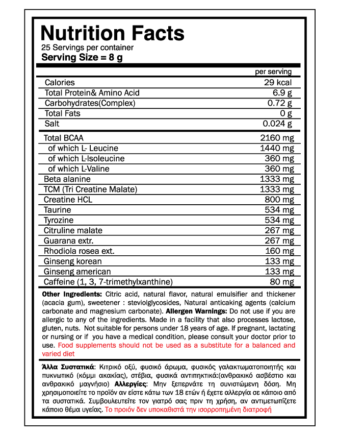 Δοσολογία: 1 γεμάτο scoop(=8γραμμάρια) 1 φορά την ημέρα 30 λεπτά πριν την προπόνηση.